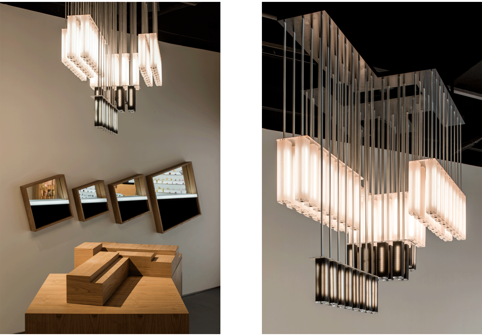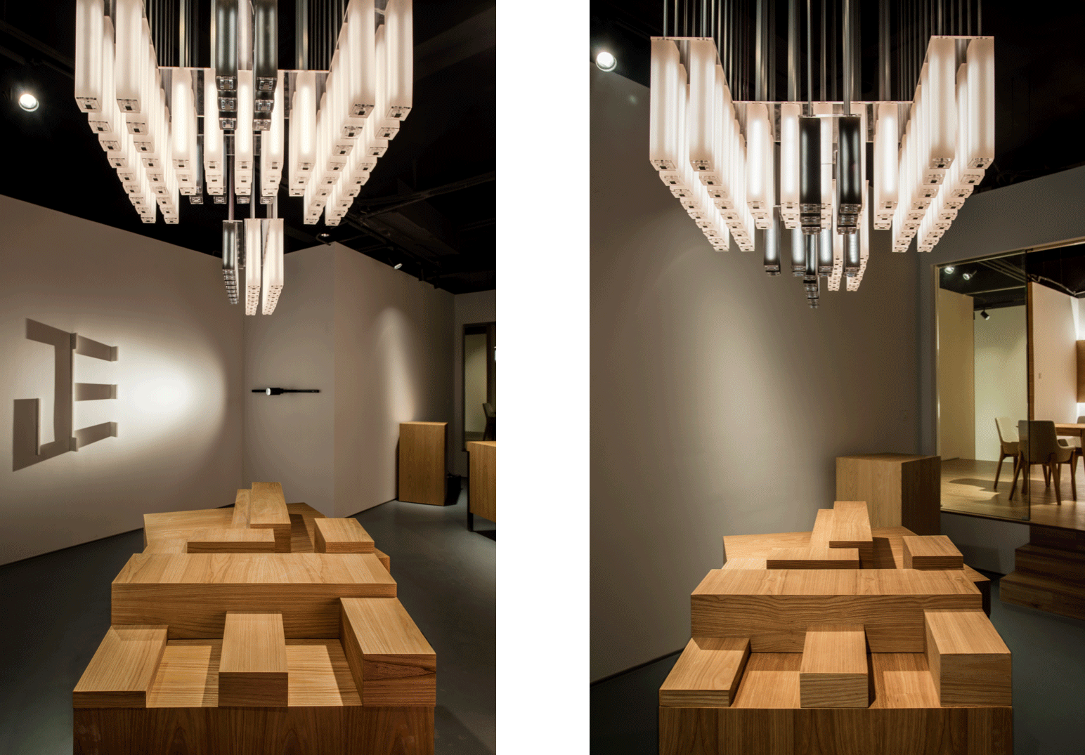 Besides the light play, we wanted to make something surprising for which rubber is suited for yet seldom considered. We experimented with making rubber light fixtures, and after numerous prototyping rounds, they turned out amazingly well. It took a while to get the right mix of both rigidity and translucency in the white and black rubber tubes. We made 3 sets of these rubber chandeliers, and they are configured differently elevation wise. But from a bottom looking up, it spells the chinese characters of Yizheng, being a mirror image of the wooden blocks on the podium below.