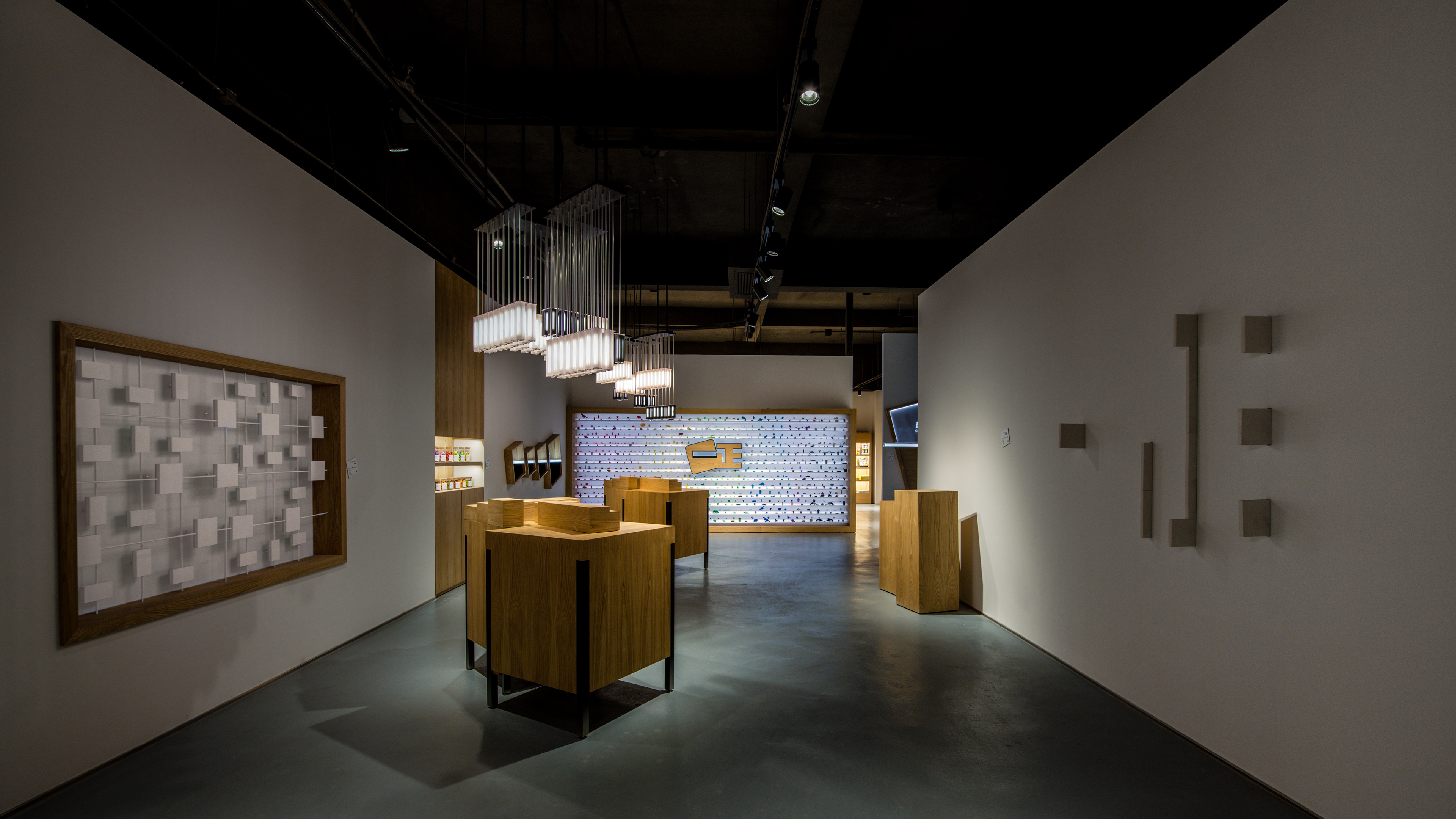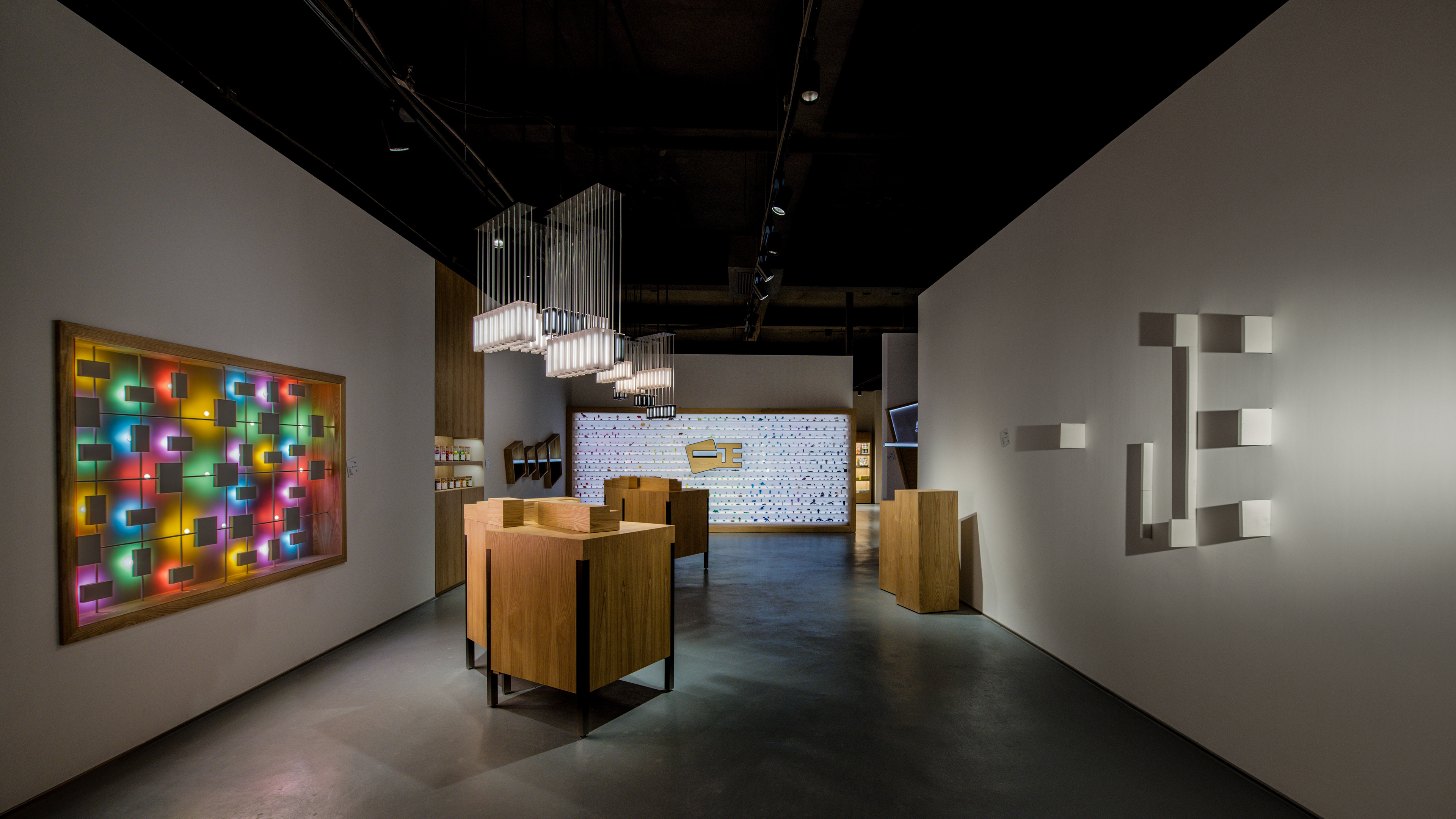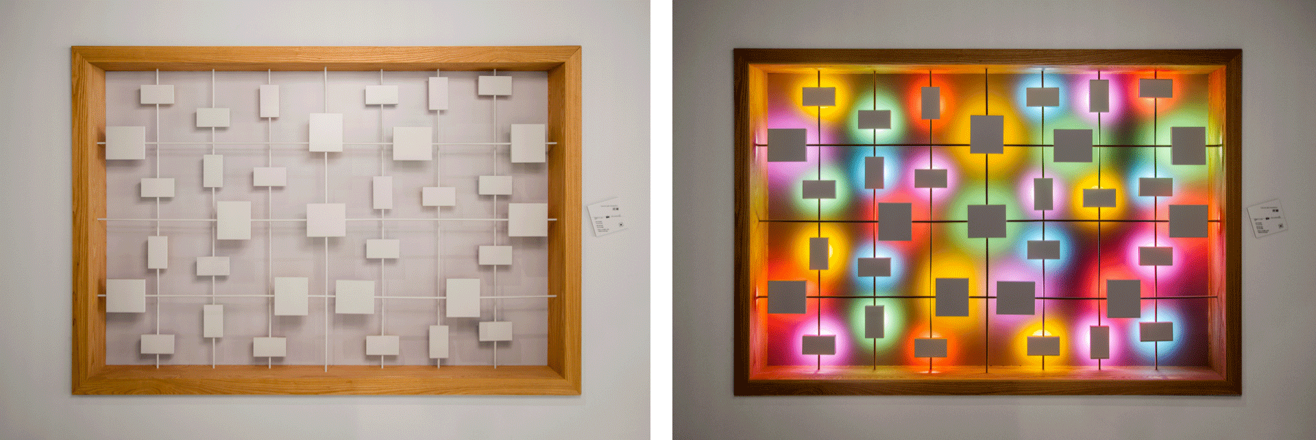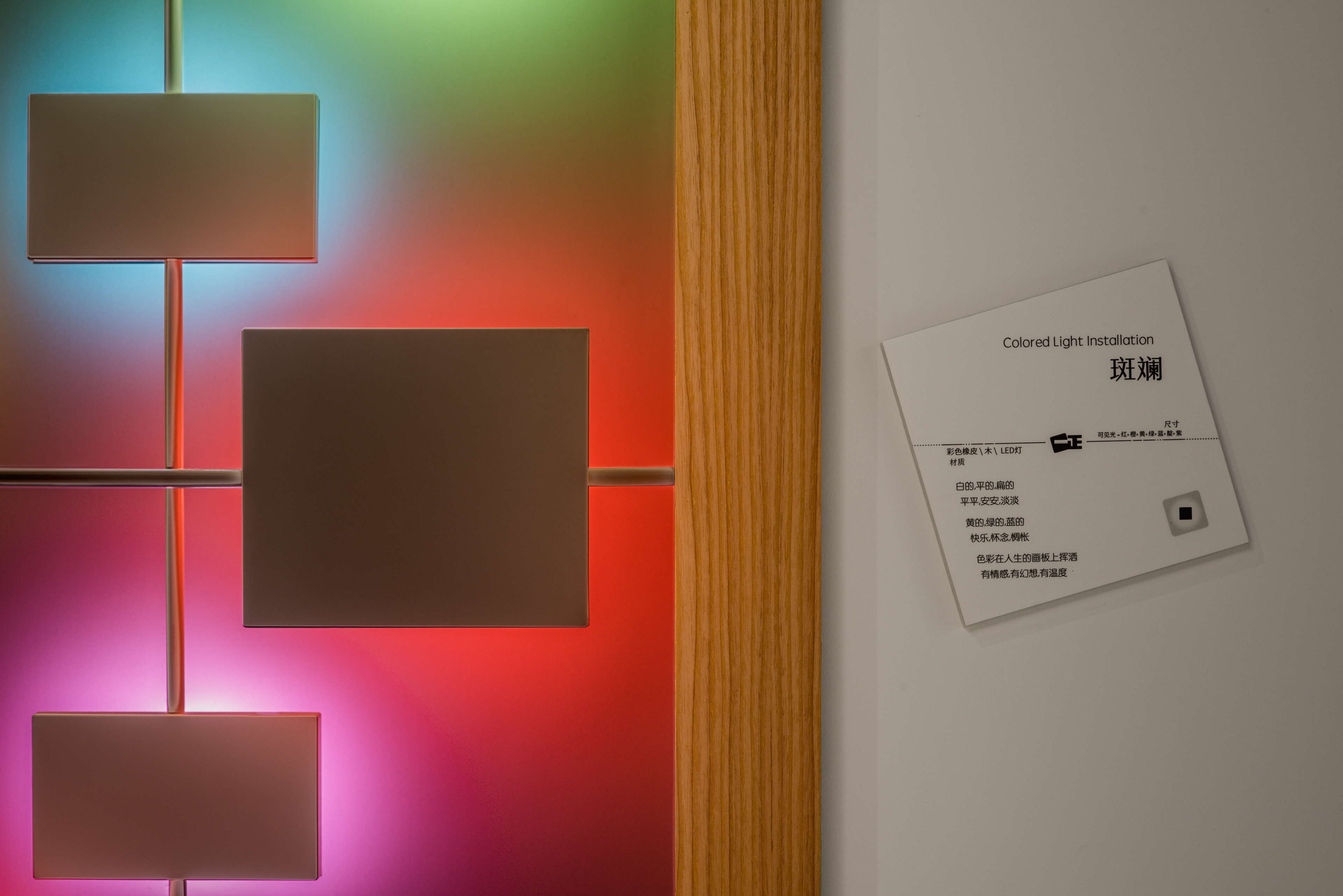 体验区里有两幅橡皮灯光装置。白色橡皮块,突出于墙面,没开灯前长得莫名,灯开了后投射出一正品牌字样。这寓意了一种品牌无影随行的陪伴。另一幅,用光打在彩色橡皮块的反射来构图。彩色橡皮快的反面是白色。这两幅都是用一种开灯前后的反差来叙述背后的故事。
