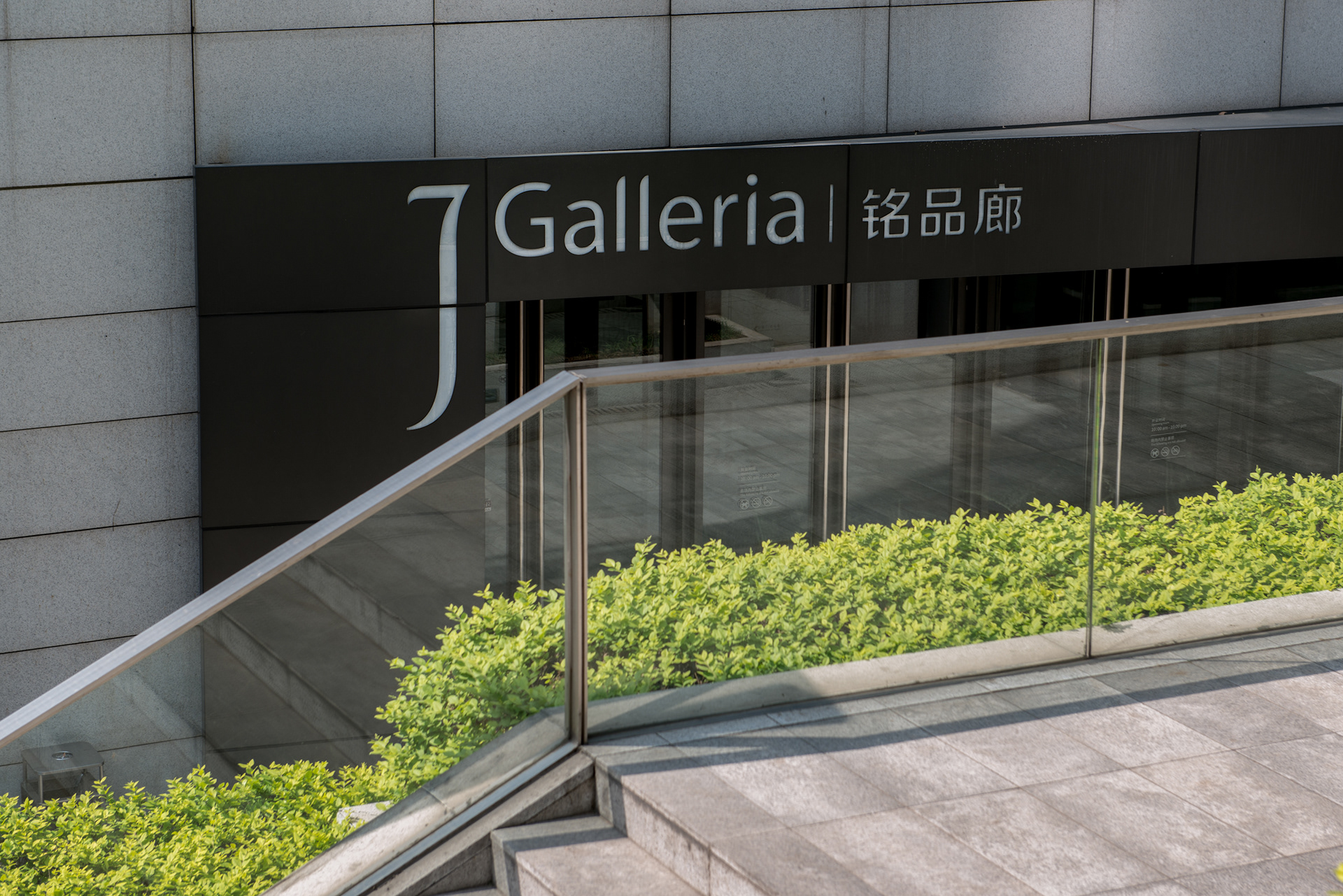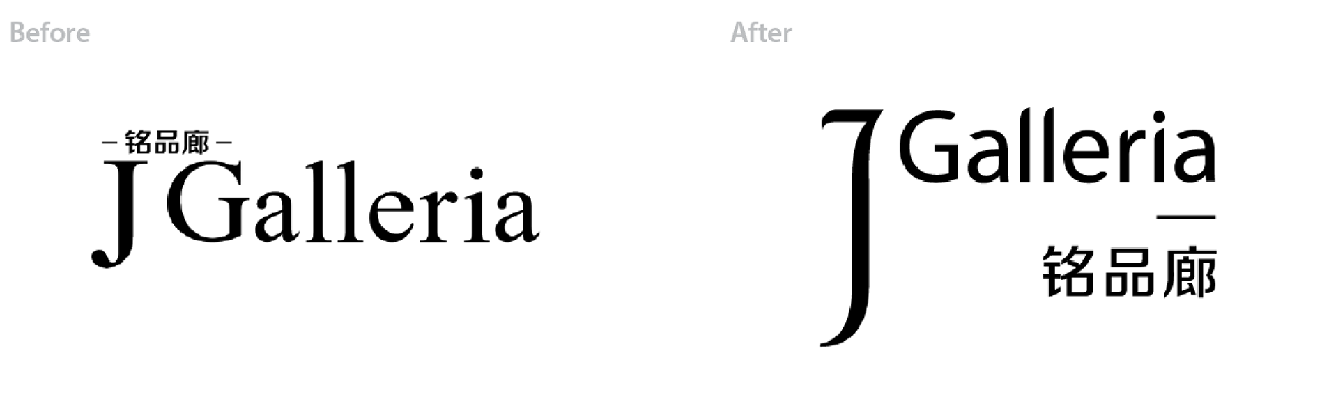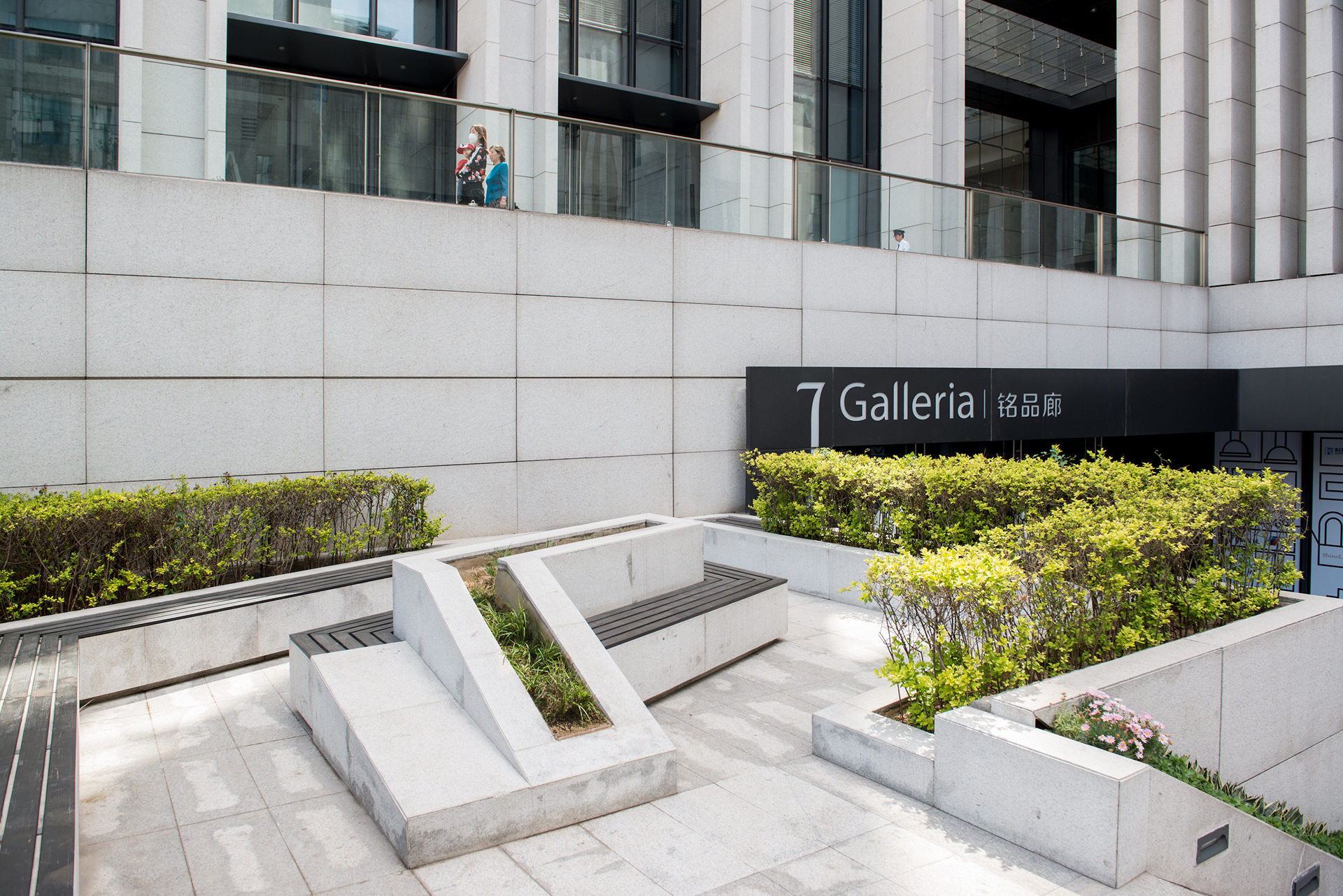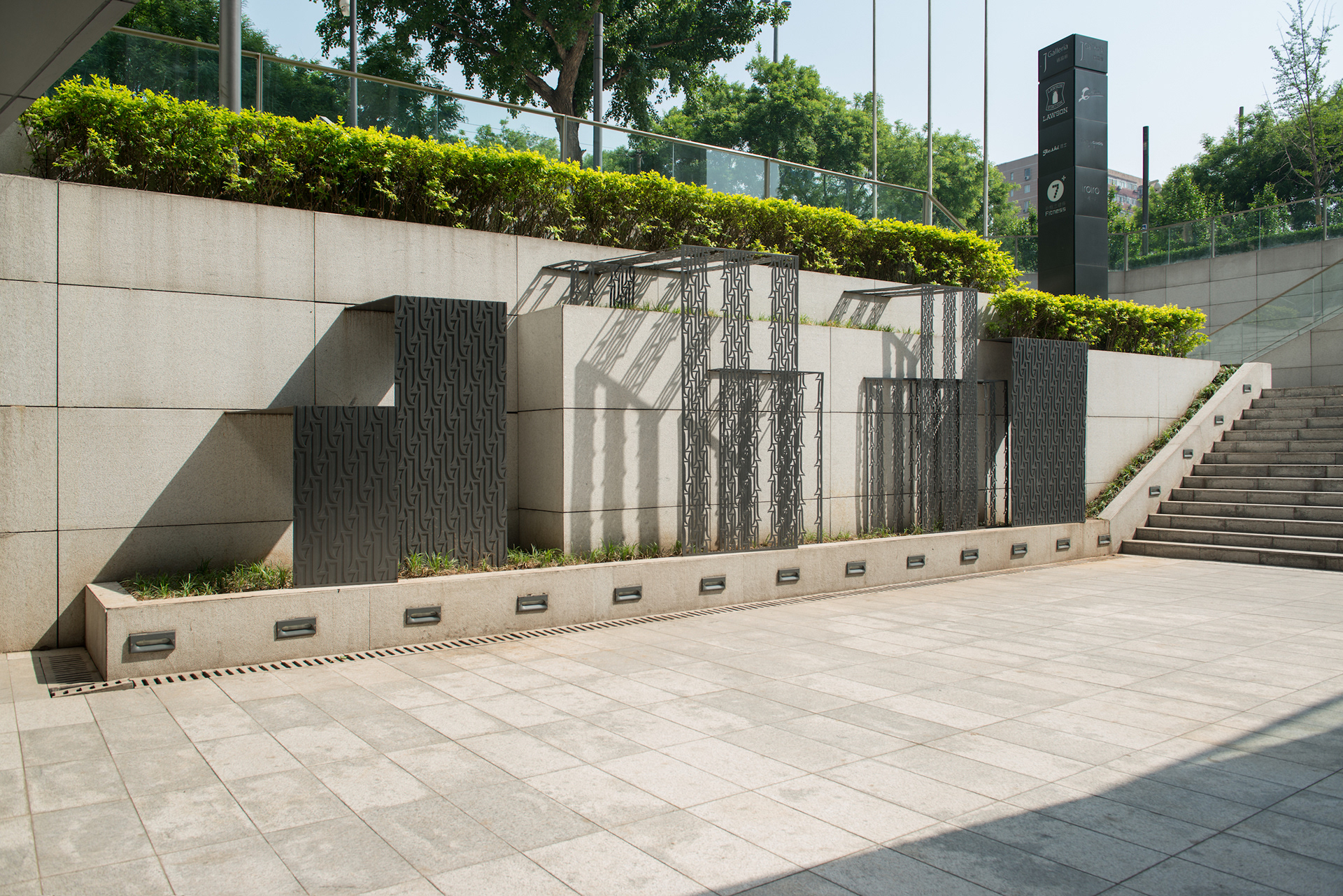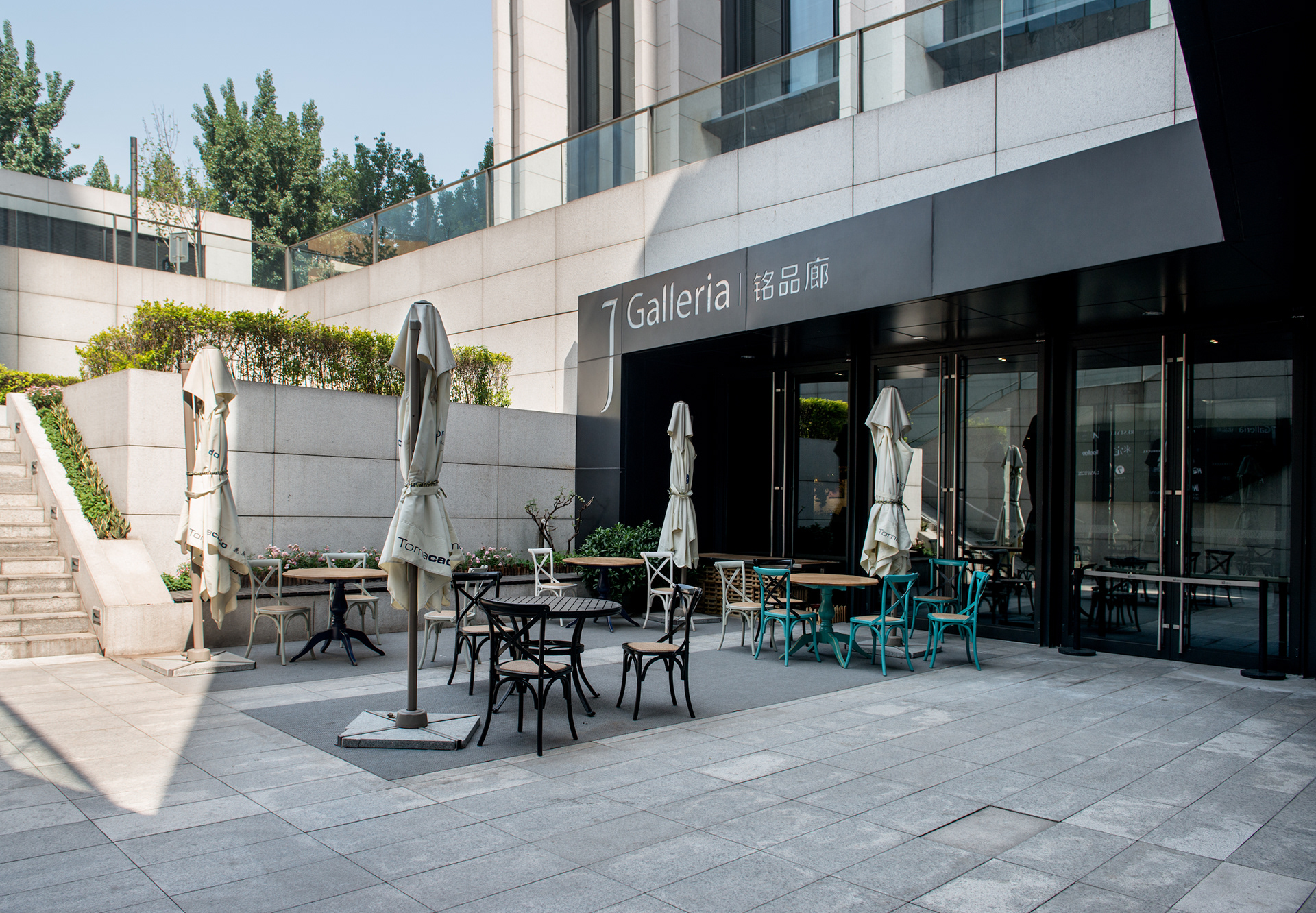 J Galleria 铭品廊 is a high end shopping mall at the basement of Jiaming Centre 嘉铭中心, along East Third Ring Rd in Beijing, China. We were approached to do A&A just before their opening. As a multi-disciplinary design studio we often take a multi-prong approach to our projects. As we progress in our discussions with the client, the owner of Jiaming Centre 嘉铭中心, we were given free rein to rebrand the retail space, on both the logo as well as the signage. The client wanted a more visible facade to the entrance. Our solution was an angled canopy that glorified the J, for the facade treatment. We were also comissioned to redesign the landscape for both the north and south plazas. For the north plaza we proposed an installation derived from the graphic motif that we developed from the brand identity. For the south plaza, we added a little rest area with seating that complemented the angled canopy.