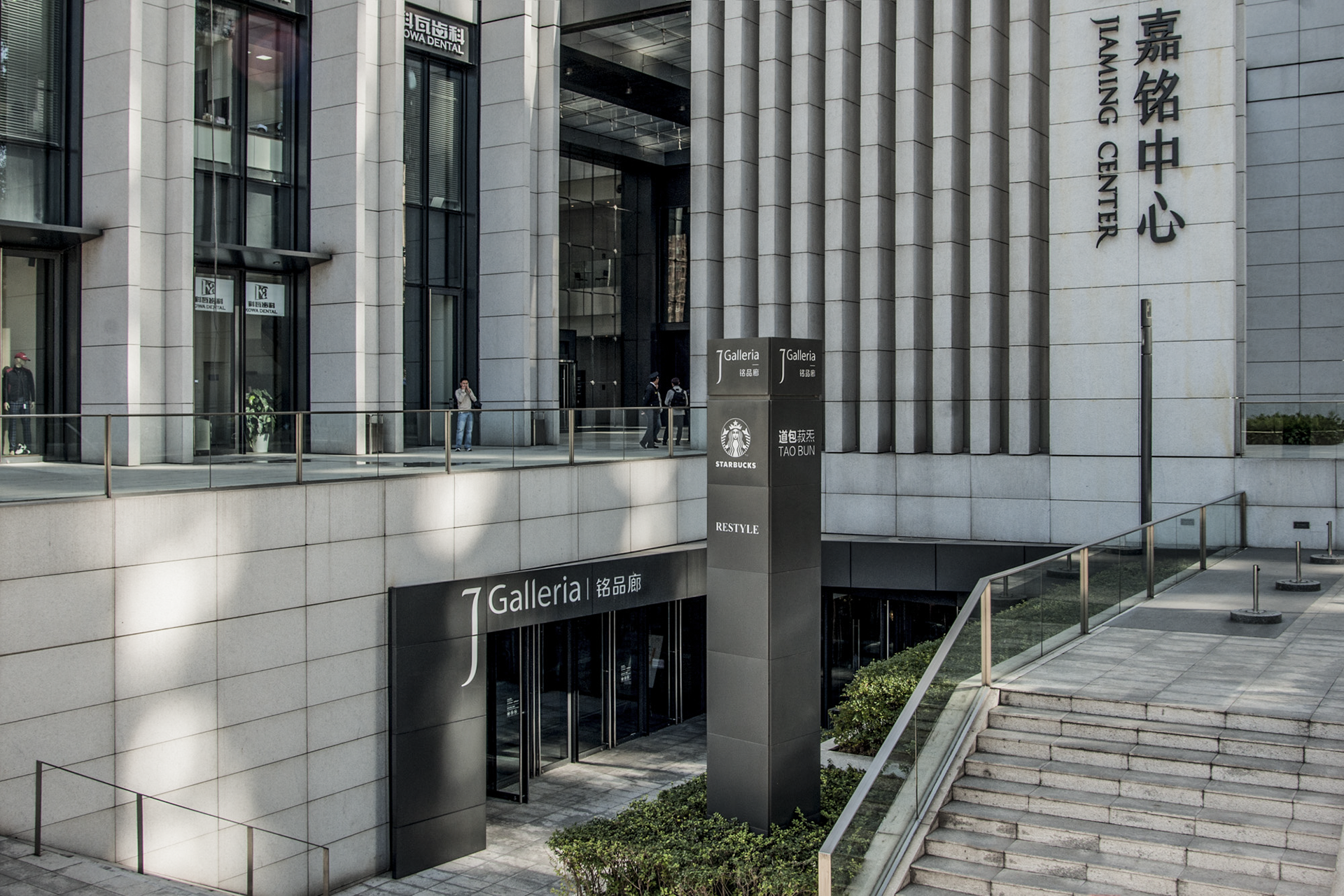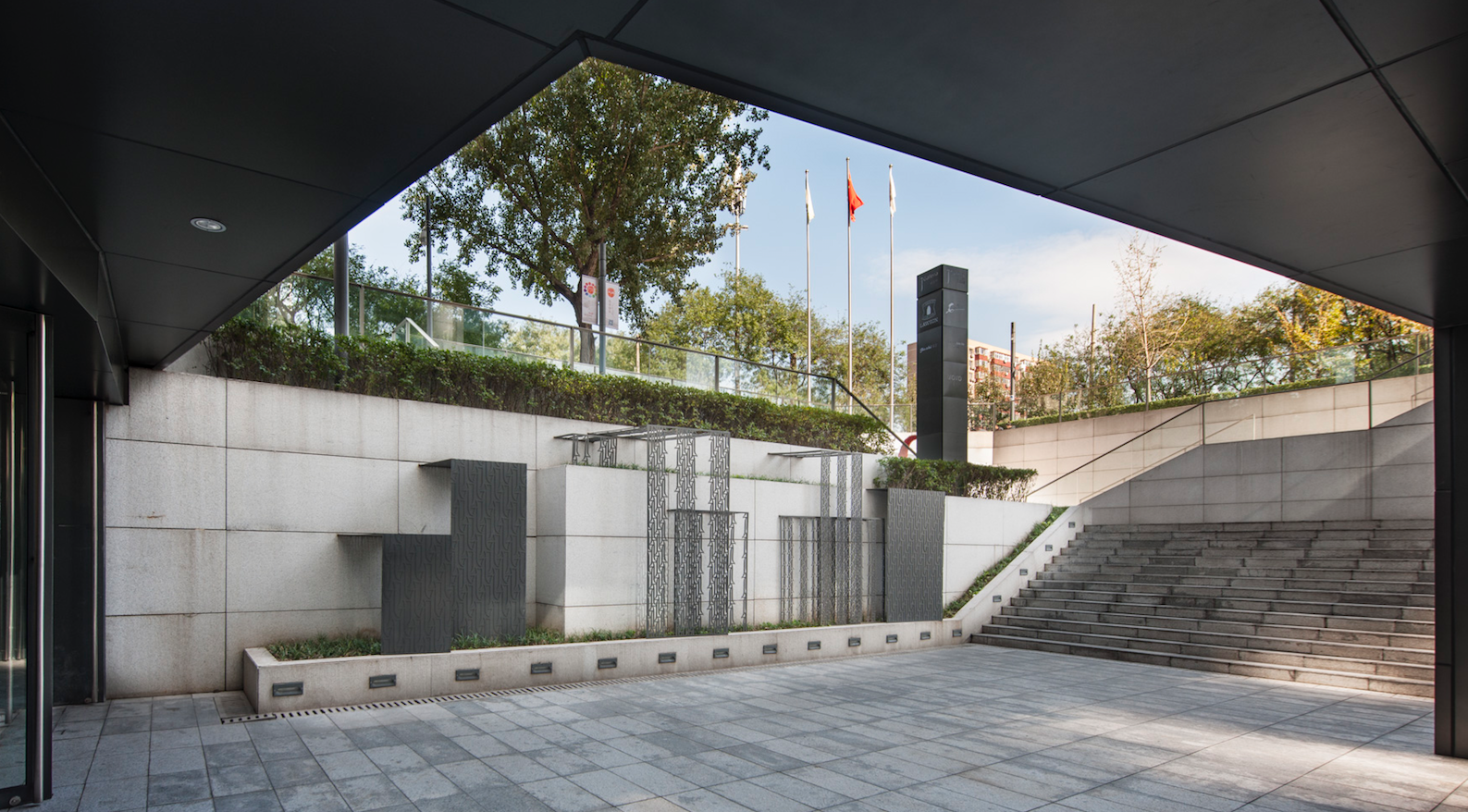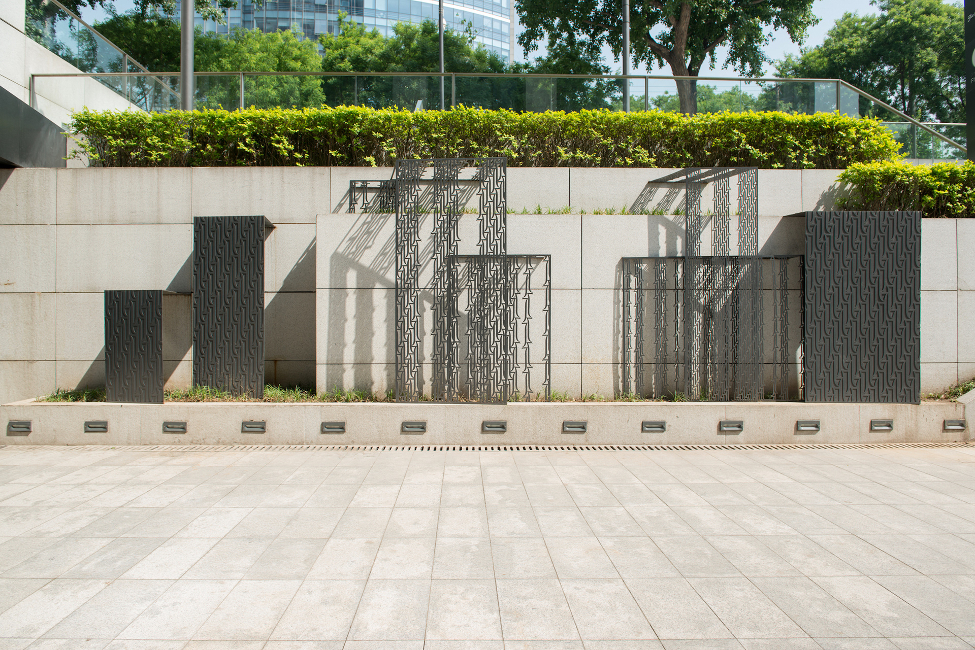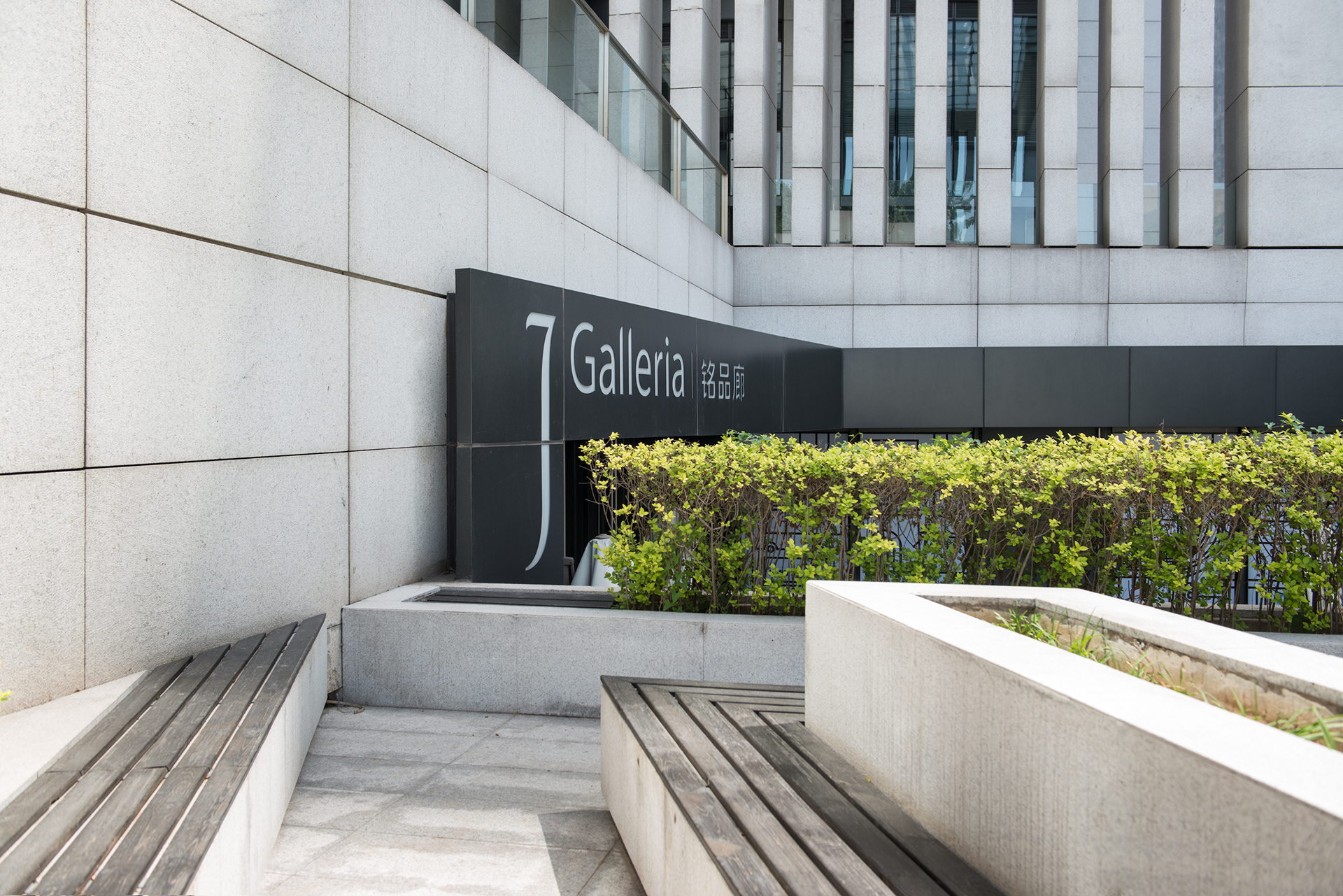 J Galleria 铭品廊 is a high end shopping mall at the basement of Jiaming Centre 嘉铭中心, along East Third Ring Rd in Beijing, China. We were approached to do A&A just before their opening. As a multi-disciplinary design studio we often take a multi-prong approach to our projects. As we progress in our discussions with the client, the owner of Jiaming Centre 嘉铭中心, we were given free rein to rebrand the retail space, on both the logo as well as the signage. The client wanted a more visible facade to the entrance. Our solution was an angled canopy that glorified the J, for the facade treatment. We were also comissioned to redesign the landscape for both the north and south plazas. For the north plaza we proposed an installation derived from the graphic motif that we developed from the brand identity. For the south plaza, we added a little rest area with seating that complemented the angled canopy.