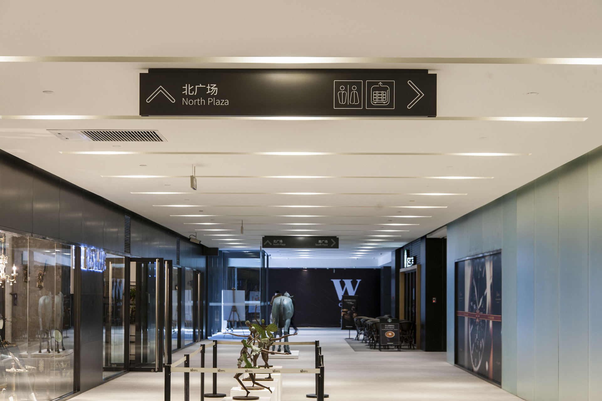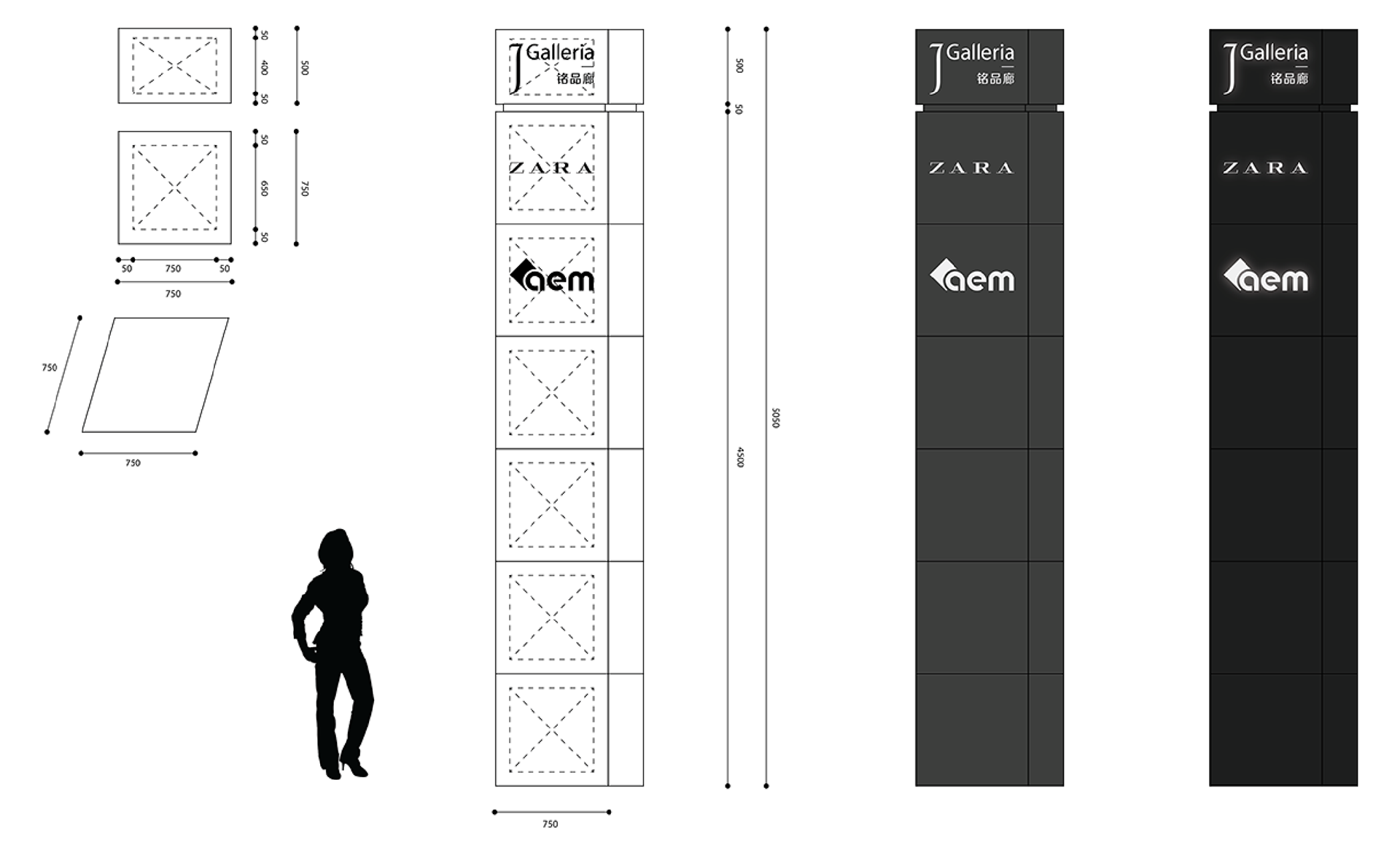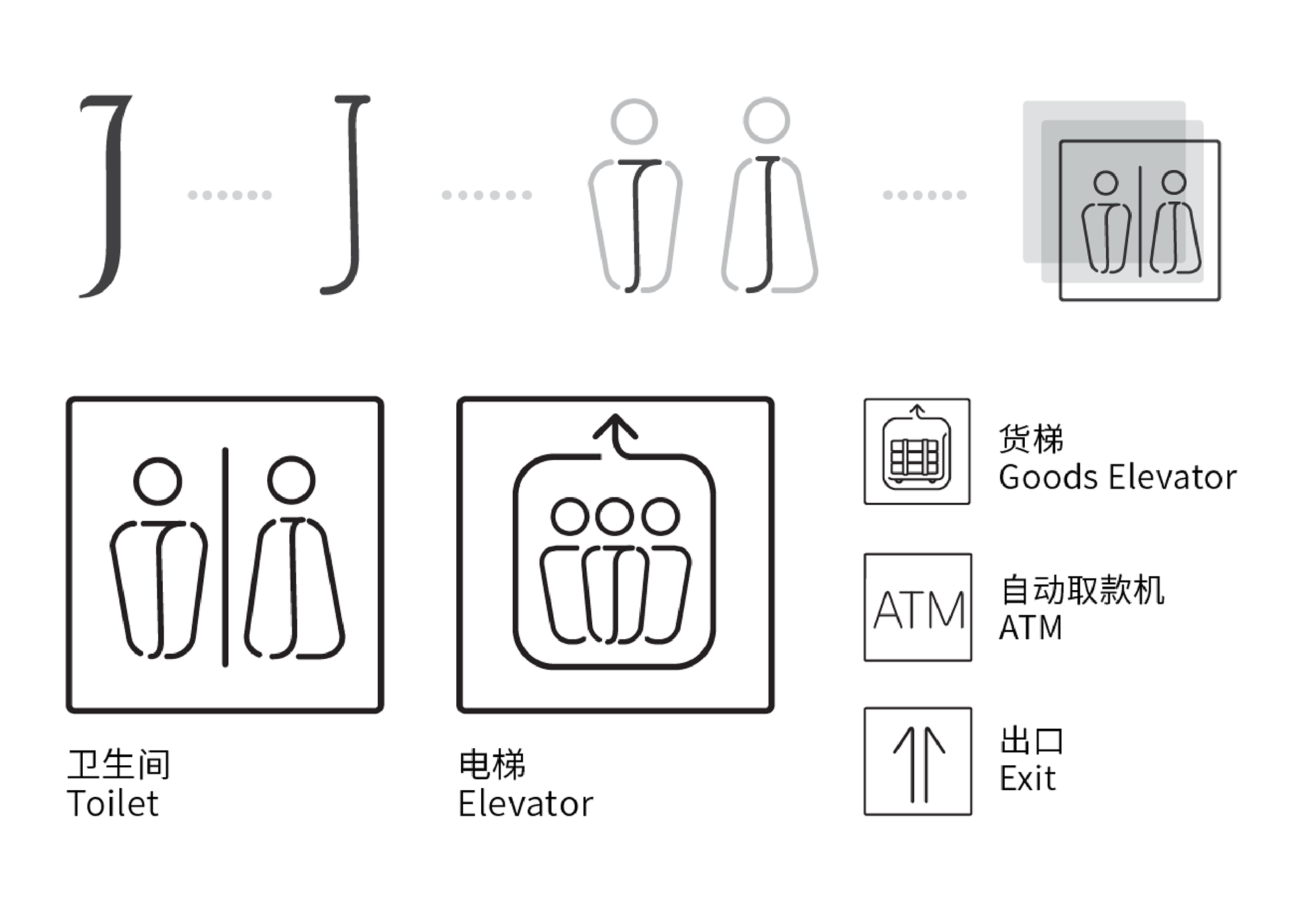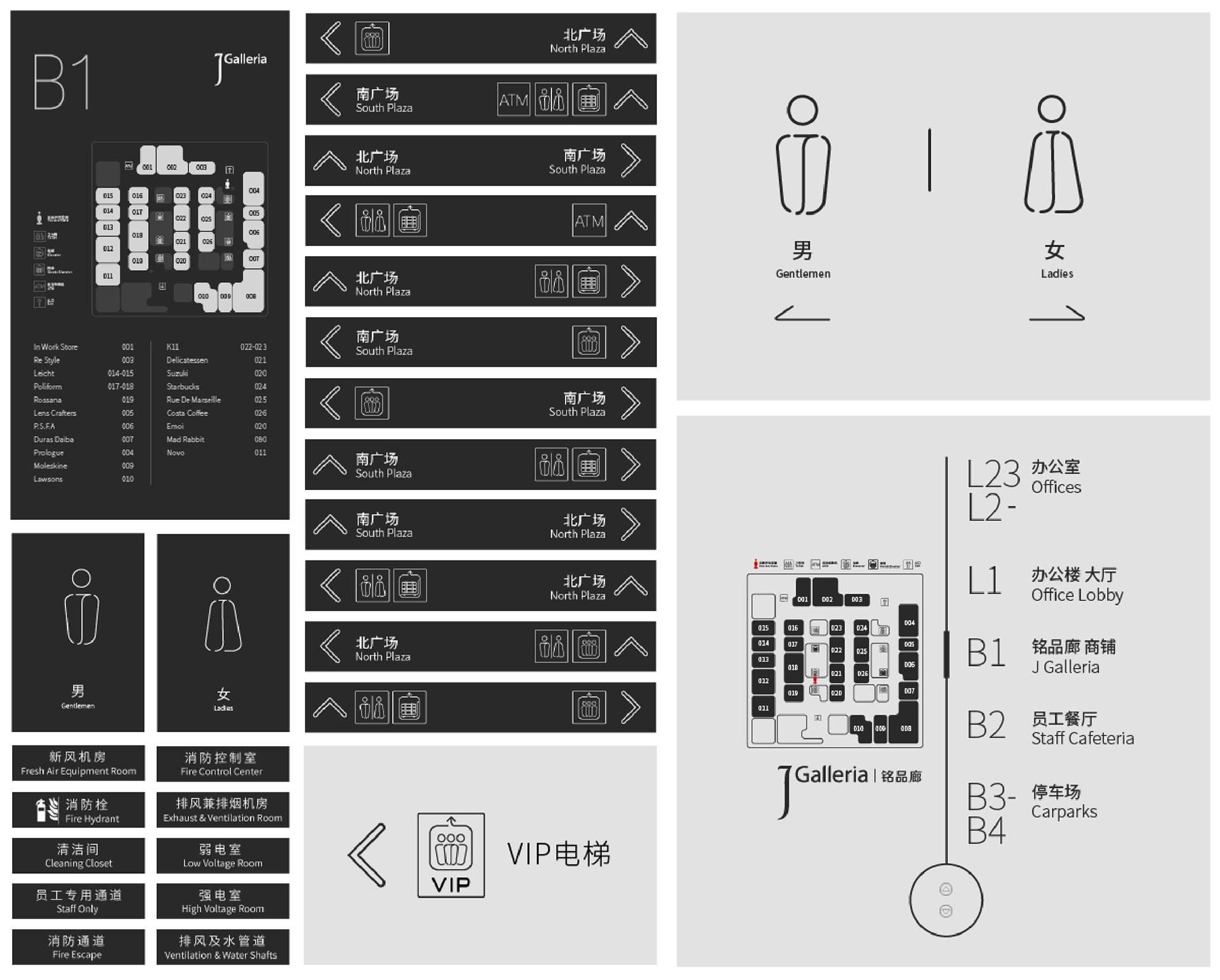 位于北京市朝阳区东三环边上,铭品廊是一个高端商场,在嘉铭中心的地下一层。在商场开业之前,我们有幸被雇主嘉铭中心联系上帮他们在开业前提供设计解决方案。作为一个跨界设计工作室,我们经常和客户探讨他们多方面的需求。在讨论中,我们确定了标示重新设计的可能性,还有导向系统的升级。由于商场入口在大楼的负一层,入口醒目对客户很重要。我们设计了一个斜面的入口顶篷,也强调了标示里的J。我们也被委托重新设计南北广场的景观。对于北广场,我们设计了一组装置艺术,运用了品牌元素里的辅助图形。对于南广场,我们在平台上增添了座位,起到和顶篷斜角相辅相承的作用。