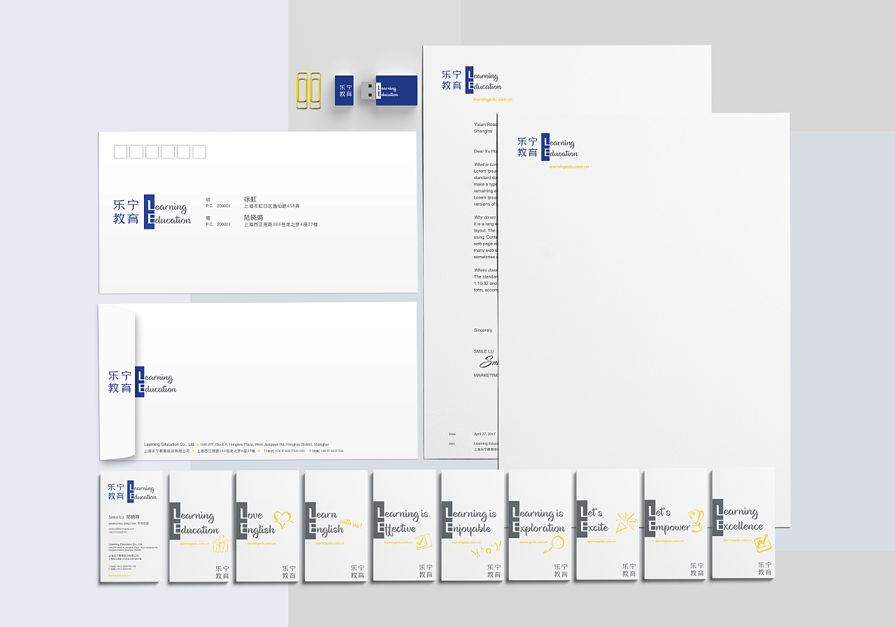 在品牌延展中,我们将标识分成两半,拆分的“ L & E ”词汇组合蕴含更大的扩展空间和兼容力。它可以传达品牌理念、学习态度甚至教学特色,在应试教育转型的大时代下,实用型、互动型的教与学关系已然成为主流,“ L & E ”的组合词汇生动的呈现了这种在学习中寻找乐趣、在乐趣中自主学习的思维优势。