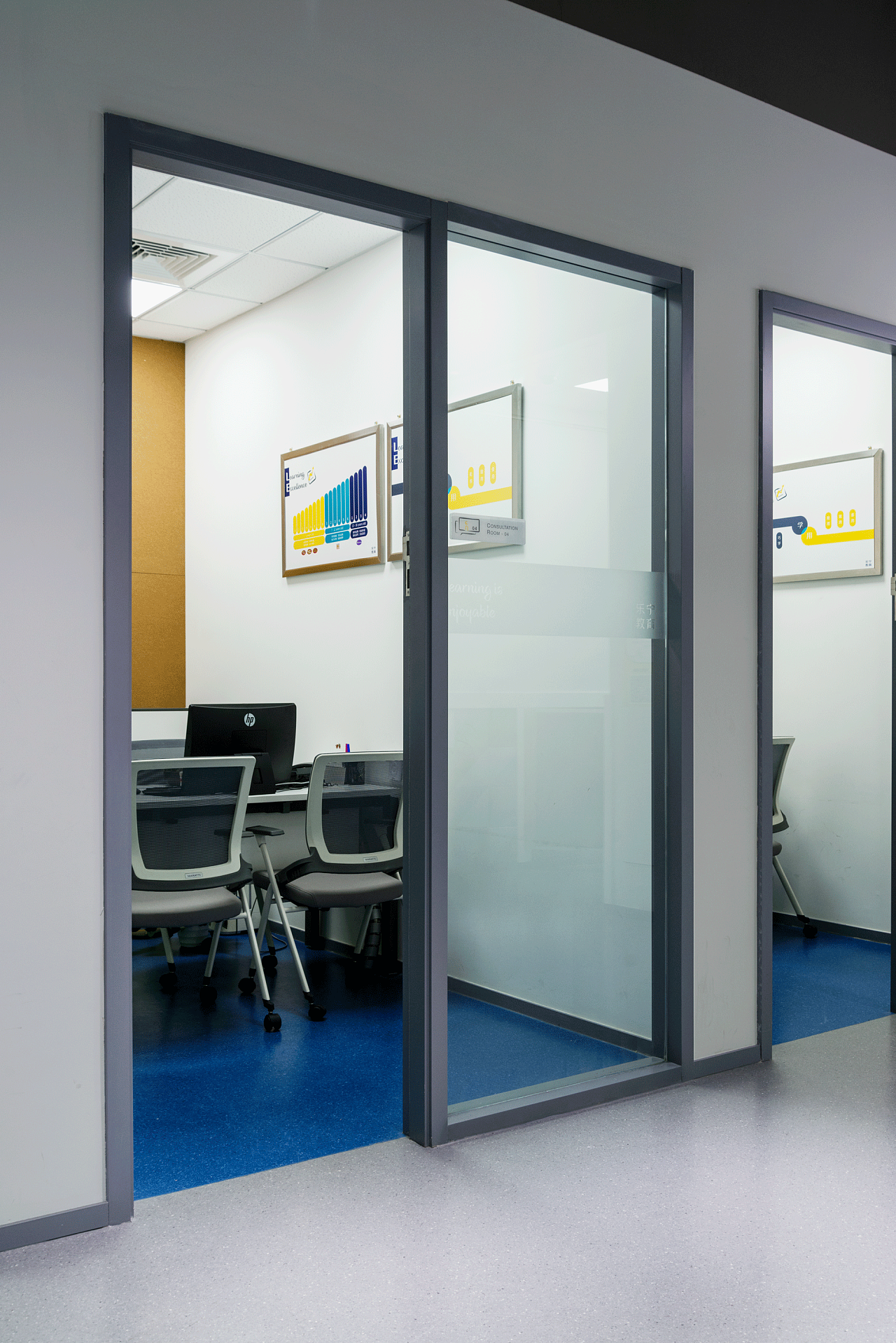 校区的门头设计,我们把亚克力Logo灯箱与广告灯箱组合使用,这样的手法极为罕见。Logo灯箱是永久性的,画面灯箱为可更替结构,根据品牌与市场推广需求实时更替画面和文字内容。由于目前正处于品牌形象更新前期,“Learning Education”的组合仍是首要的露出内容。