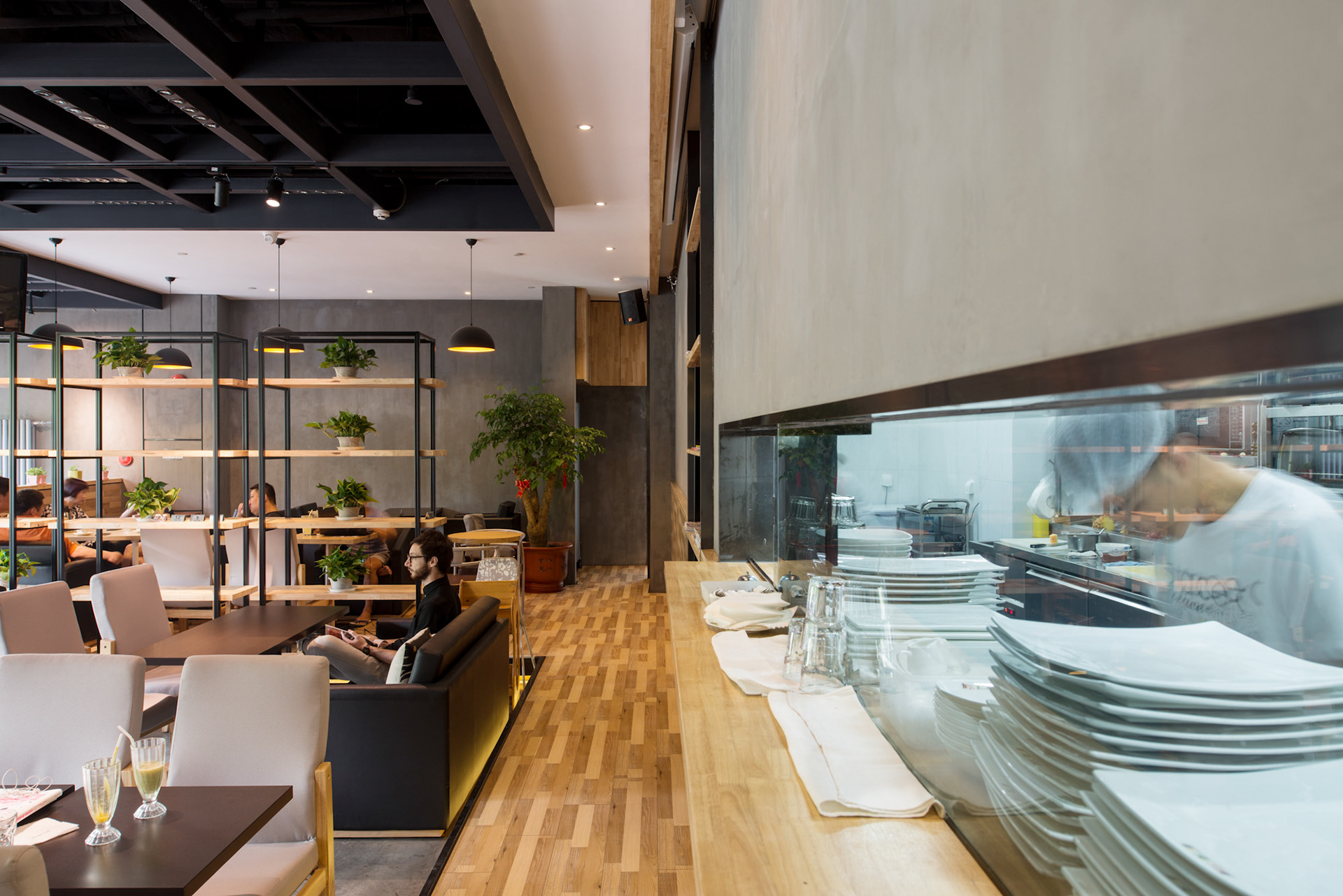 Much thought was put in to the frame language, in lining up the black metallic trimming against the concrete walls and pillars as well as the timber shelving and countertops, resonating with the H compositions of the ceiling in an elevational relationship.