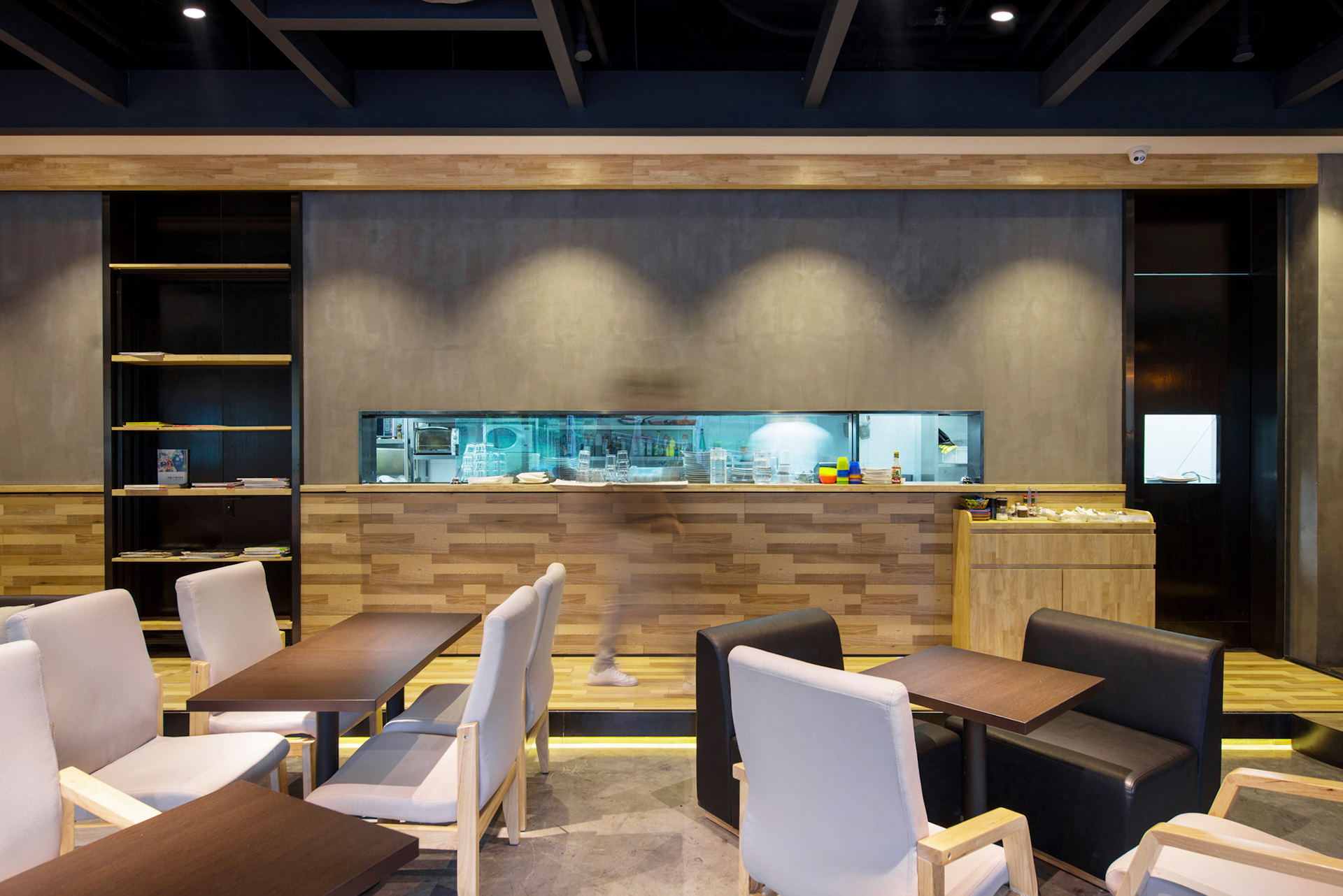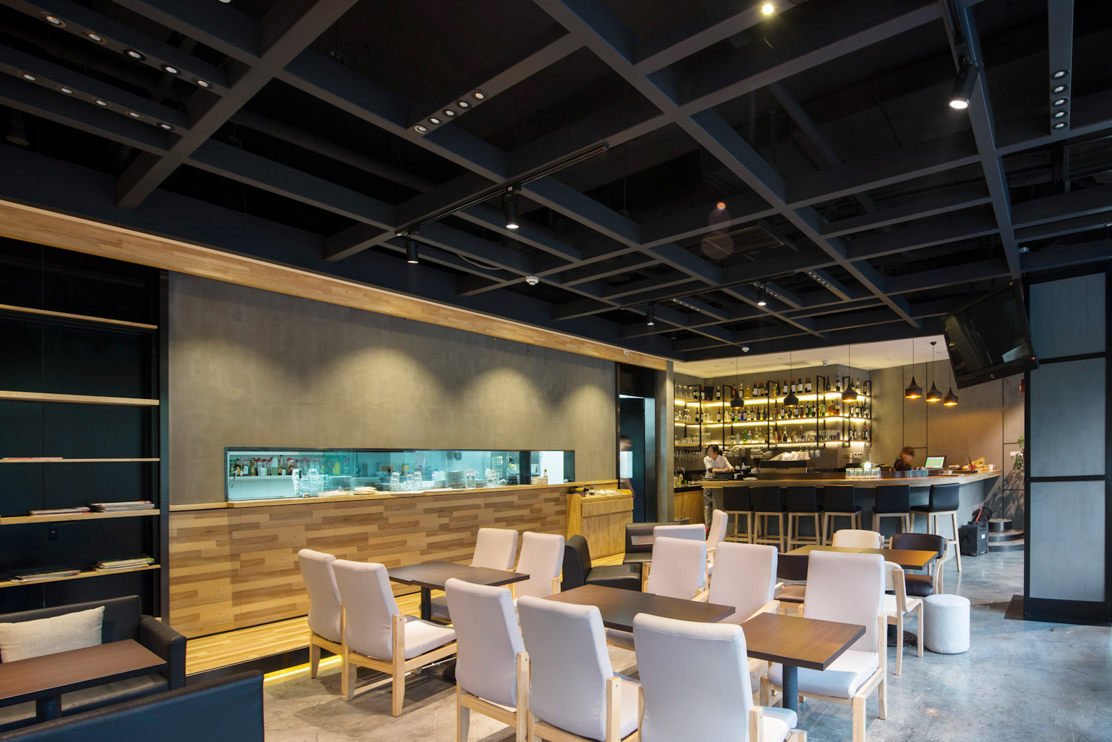 The Place Cafe is a bustling f&b venue at a high end residential district in Central Park, Chaoyang Beijing. For the face lift, we worked with the client to create an industrial look open plan space that can also be used as a special events venue. Concrete, timber and matt black metal were used throughout the cafe. The timber deck serves as a service platform and to direct traffic to the toilet behind away from main seating areas. A metallic ceiling grid with varying H compositions both provide track lighting as well as masking the service M&E equipment tucked behind.