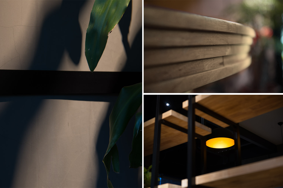 我们花了很多心思在结构语言上:黑色铁艺线条穿梭于水泥墙柱和木制平面之中,把不同的立面结构线组成巧妙的构图。