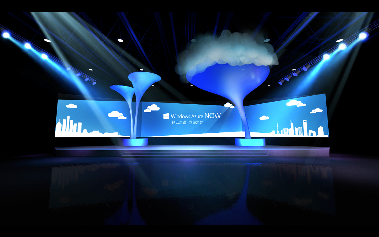 台上的三个装置代表了微软的三种云服务:私有云,公有云,和混合云。它们结合了投影技术带出后面LED屏幕的视频内容。