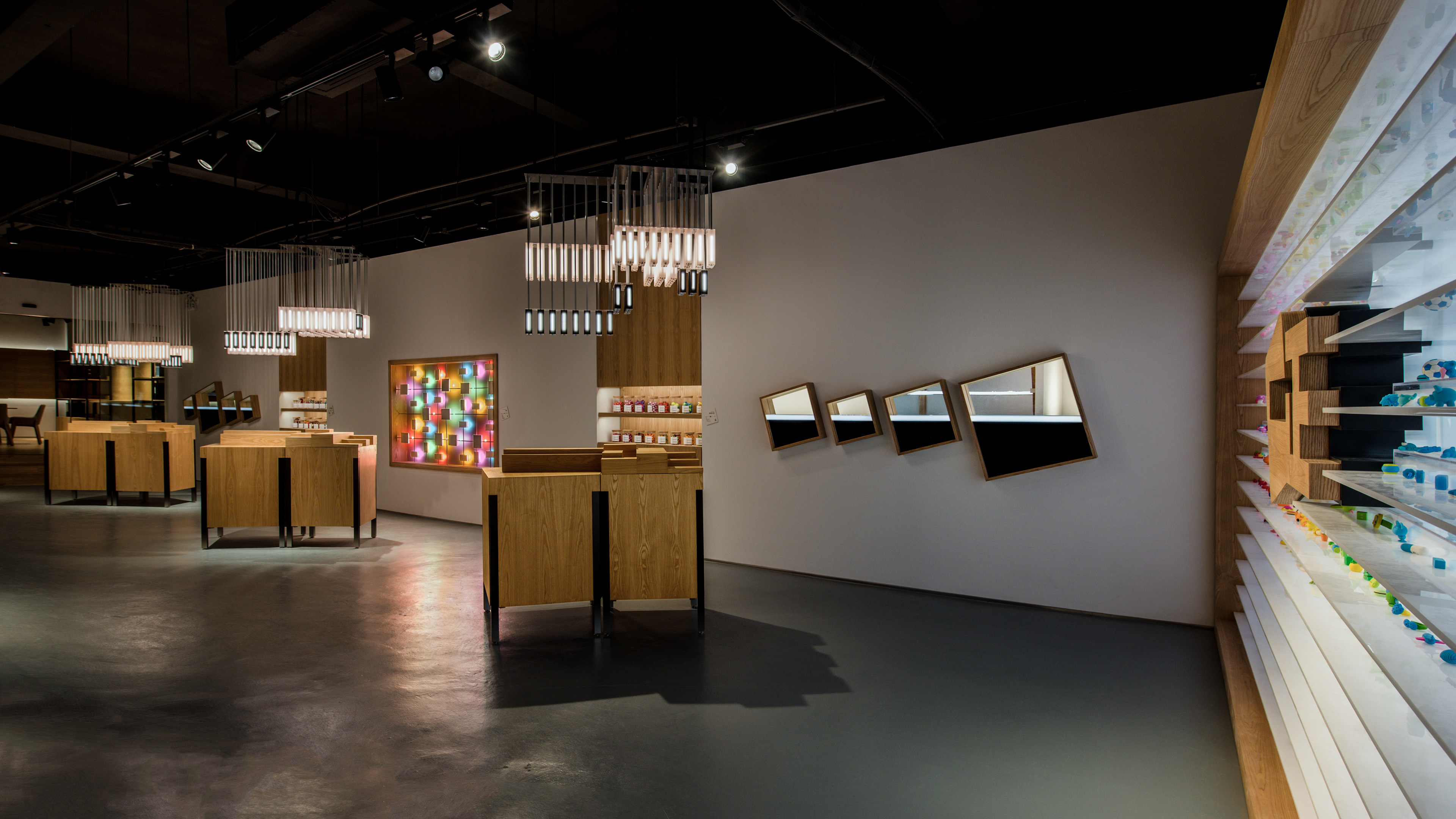 体验区里有两幅橡皮灯光装置。白色橡皮块,突出于墙面,没开灯前长得莫名,灯开了后投射出一正品牌字样。这寓意了一种品牌无影随行的陪伴。另一幅,用光打在彩色橡皮块的反射来构图。彩色橡皮快的反面是白色。这两幅都是用一种开灯前后的反差来叙述背后的故事。