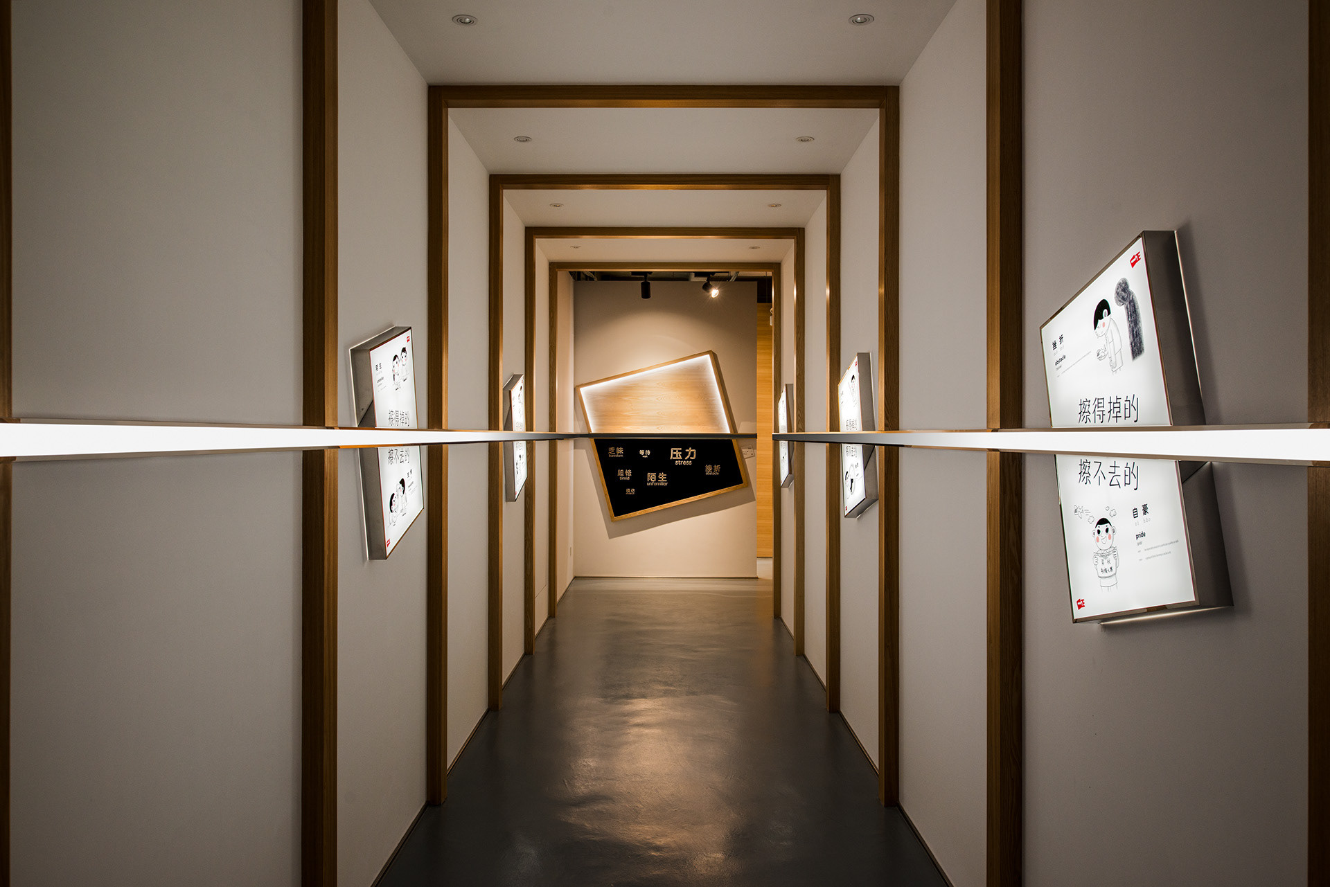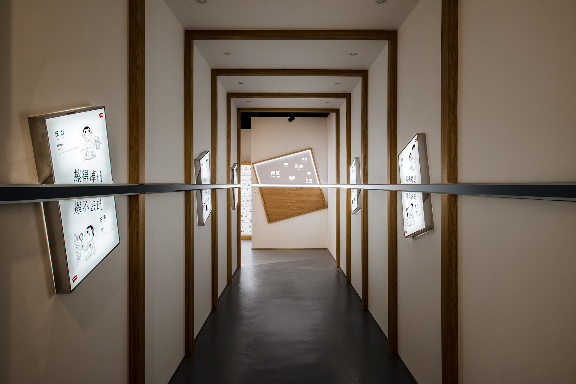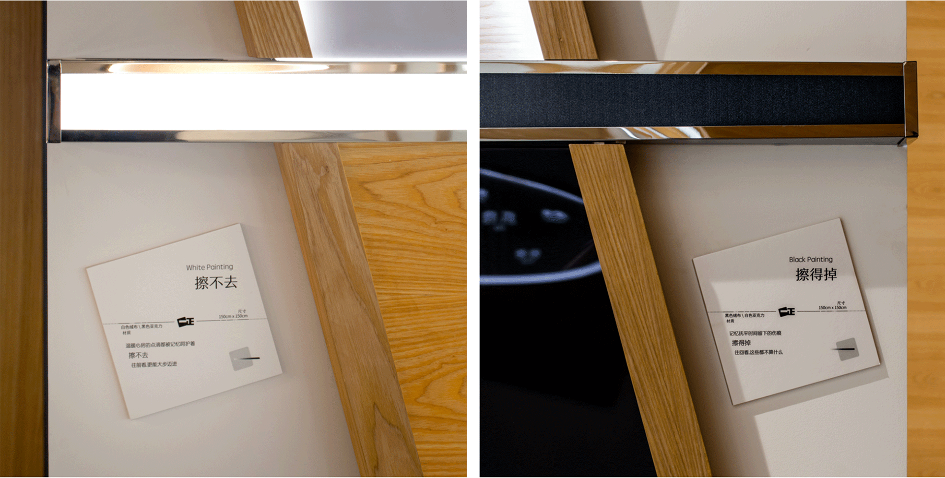 从空间角度,这个通道不只是起到一个空间转换的作用。这通道的墙上斜挂着这五幅主题海报。15 度斜度来自 logo 原用的倾斜度。一条黑渐变到白色发光的线,贯穿了这些海报,分割了这些事情的两面。这条线就是主题 “擦得掉/擦不去” 的线。这条线再沿着通道墙折回通道两端。这两端分别有两幅画,白的 “擦不去” 的,和黑的 “擦得掉” 的。这像一个时间隧道,有了正确的引导,往前看,就看到了自己的各种擦不去的成长。回头看,原来克服了这么多困难,都被擦掉了。